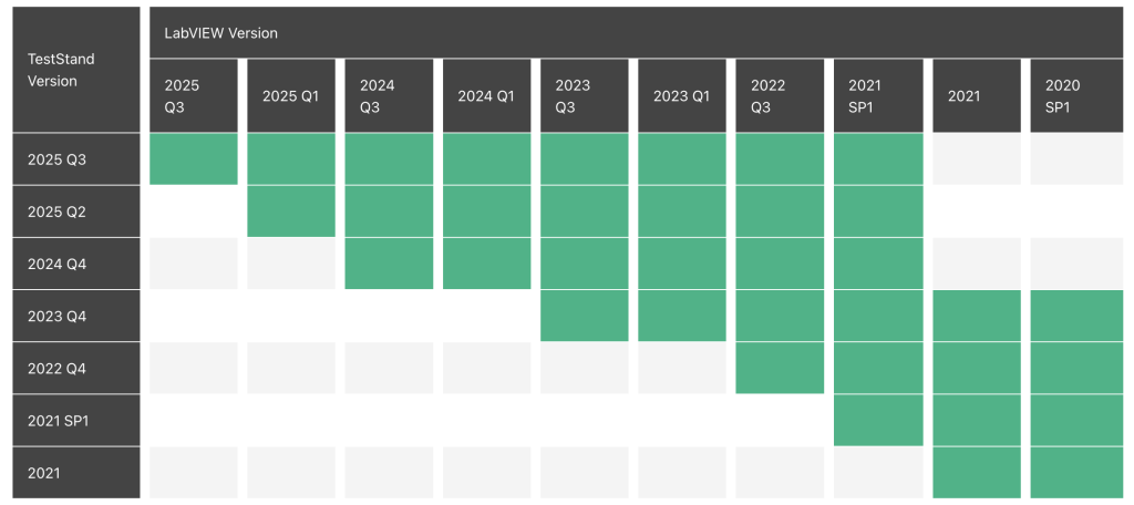 请使用此表格,将 NI TestStand 的版本与处于主流支持阶段的 LabVIEW 兼容版本进行对照。
